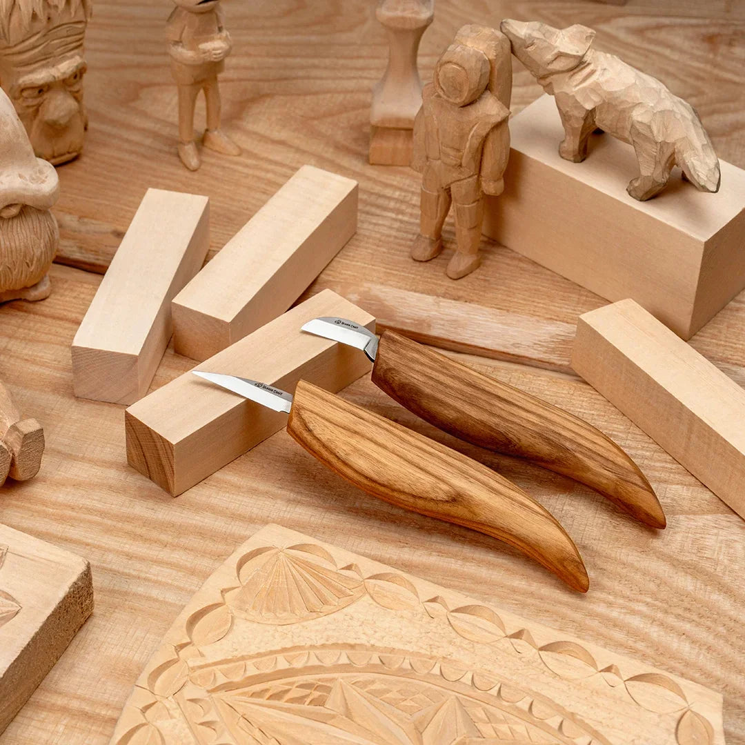Al adquirir el Kit de Cuchillos para Tallado Inicial BeaverCraft S16, todo aficionado a la talla en madera recibe herramientas de talla de primera clase y confiables. El contenido del conjunto agradará a cualquier tallador, sin importar su experiencia. Incluye cinco bloques de tilo de excelente calidad para tus experimentos de talla y dos cuchillos profesionales (un cuchillo para tallar pequeñas figuras y caricaturas y un cuchillo para talla en relieve para técnicas delicadas de corte en madera).