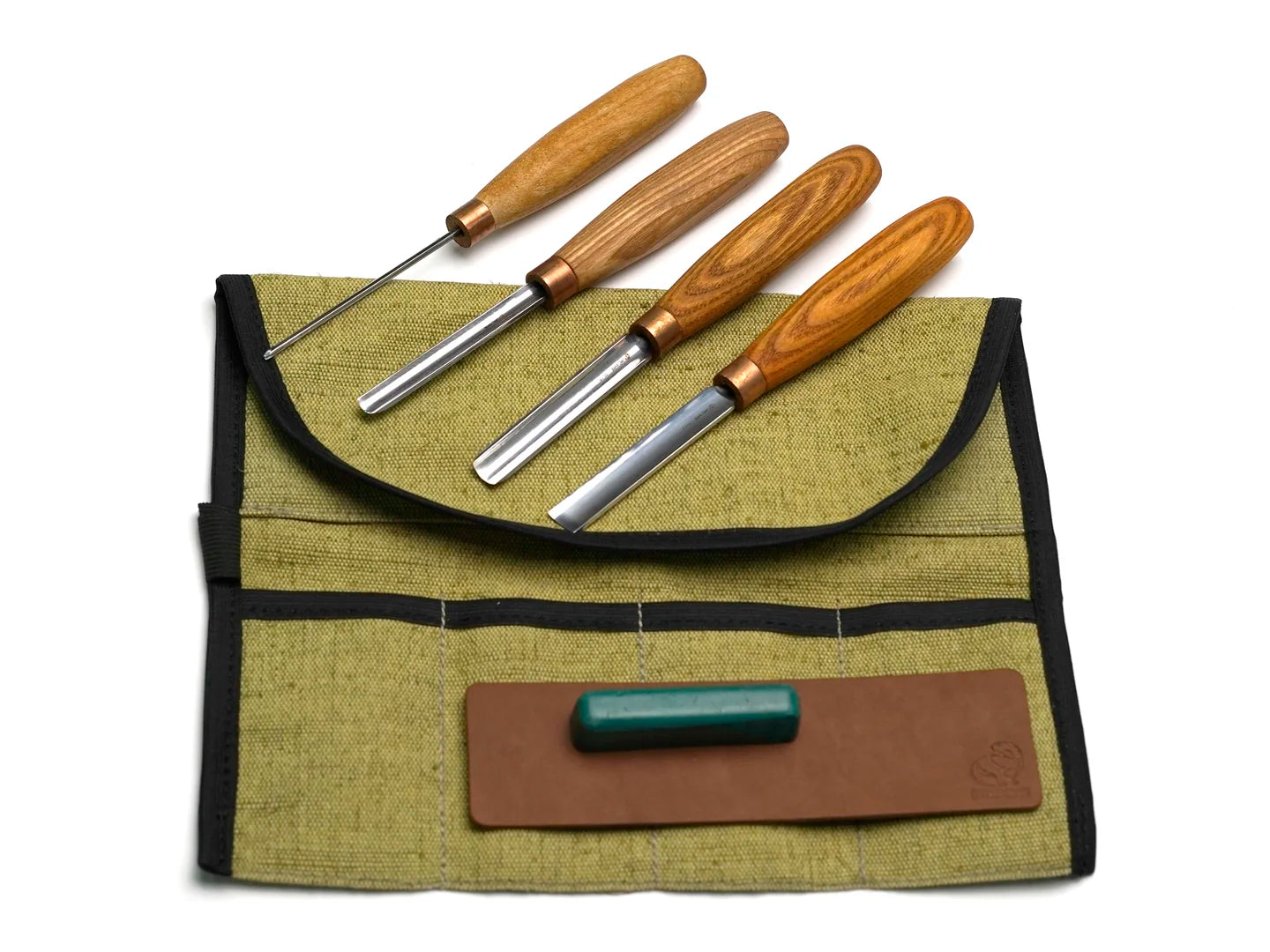 I have never done any wood carving. This set is easy to use and provide a variety of blades that work for me. I found them to be very sharp. It comes with a leather thing which i have not figured out set and a sharpening stone. It even comes with a band aid! Nice set.